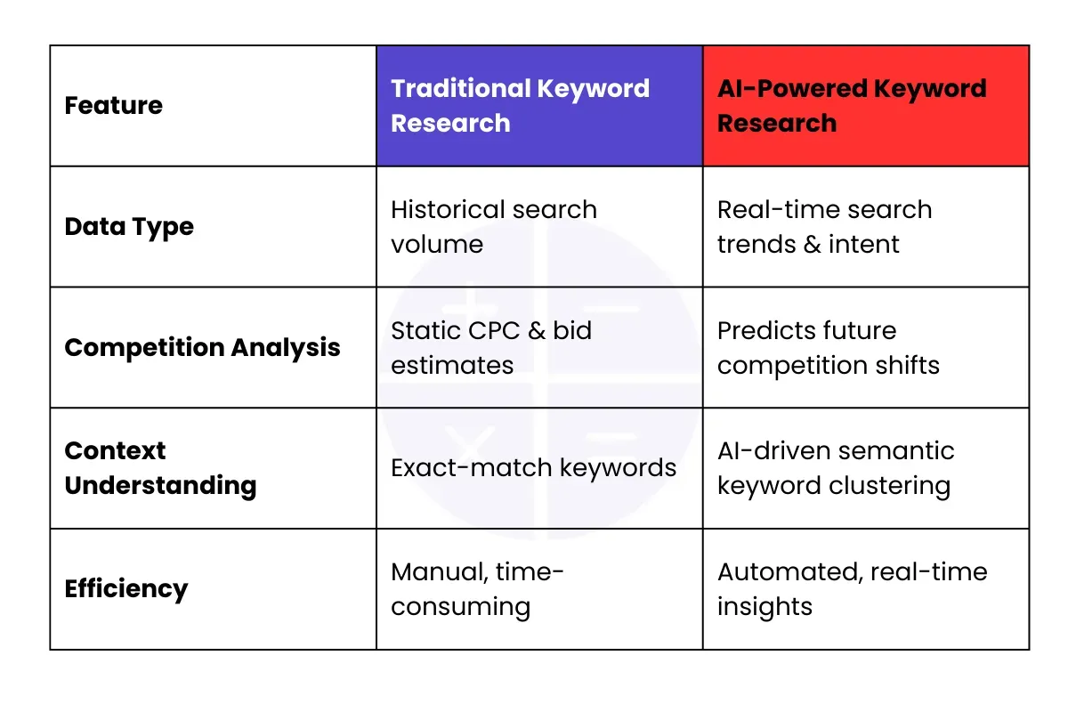 Feature Traditional Keyword Research AI-Powered Keyword Research Data Type Historical search volume Real-time search trends & intent Competition Analysis Static CPC & bid estimates Predicts future competition shifts Context Understanding Exact-match keywords AI-driven semantic keyword clustering Efficiency Manual, time-consuming Automated, real-time insights