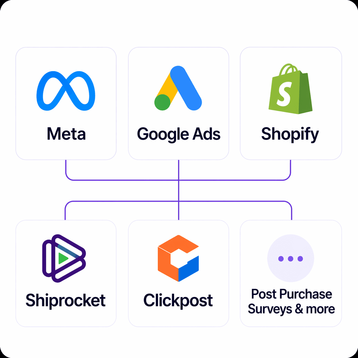 Meta · Google Ads · Shopify · Shiprocket · Clickpost · Post Purchase Surveys & more