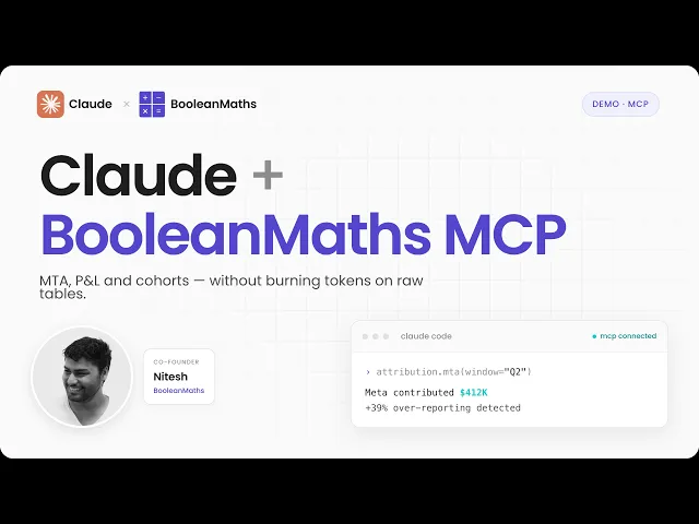 BooleanMaths MCP transforms raw tables into a pre-modelled layer with clear definitions and marketing primitives—so Claude Code delivers reliable answers without manual setup.