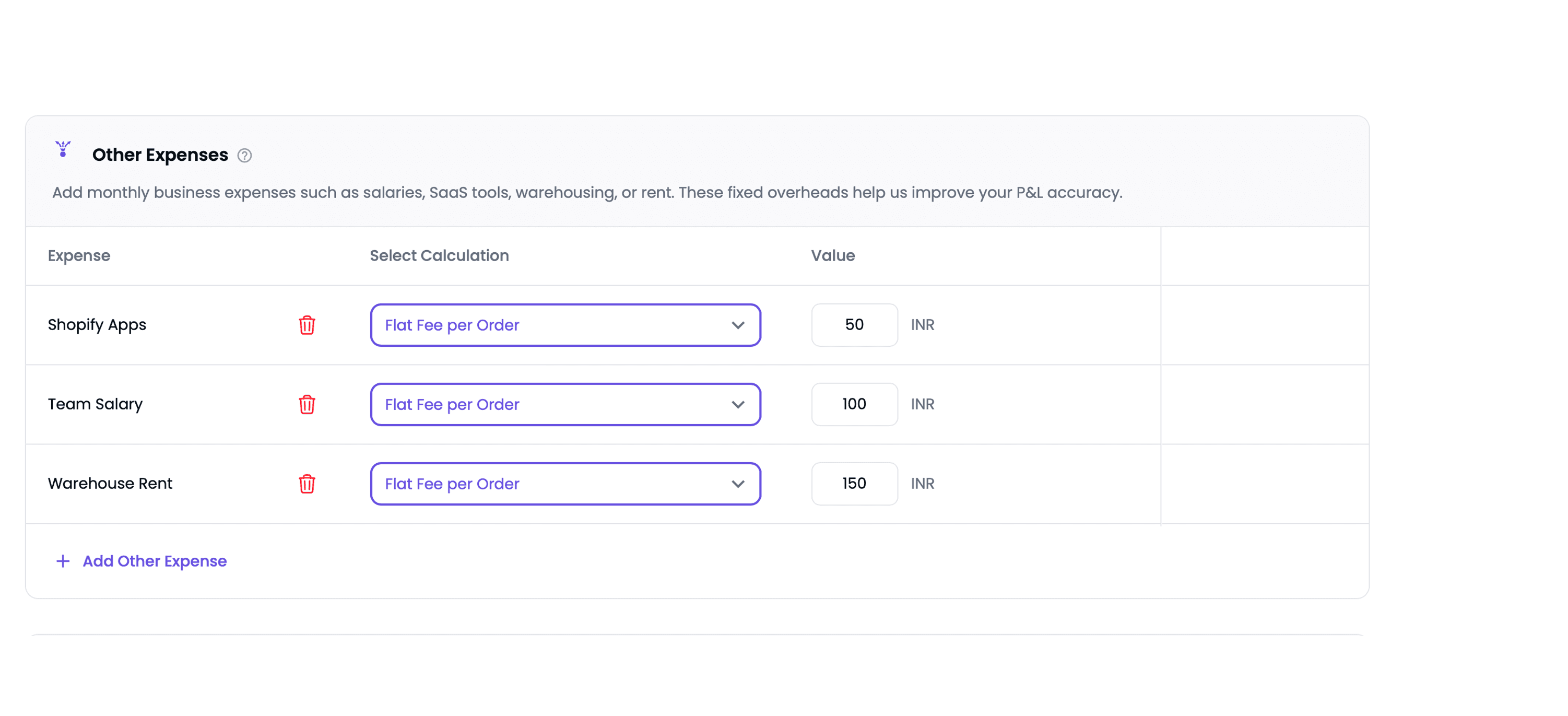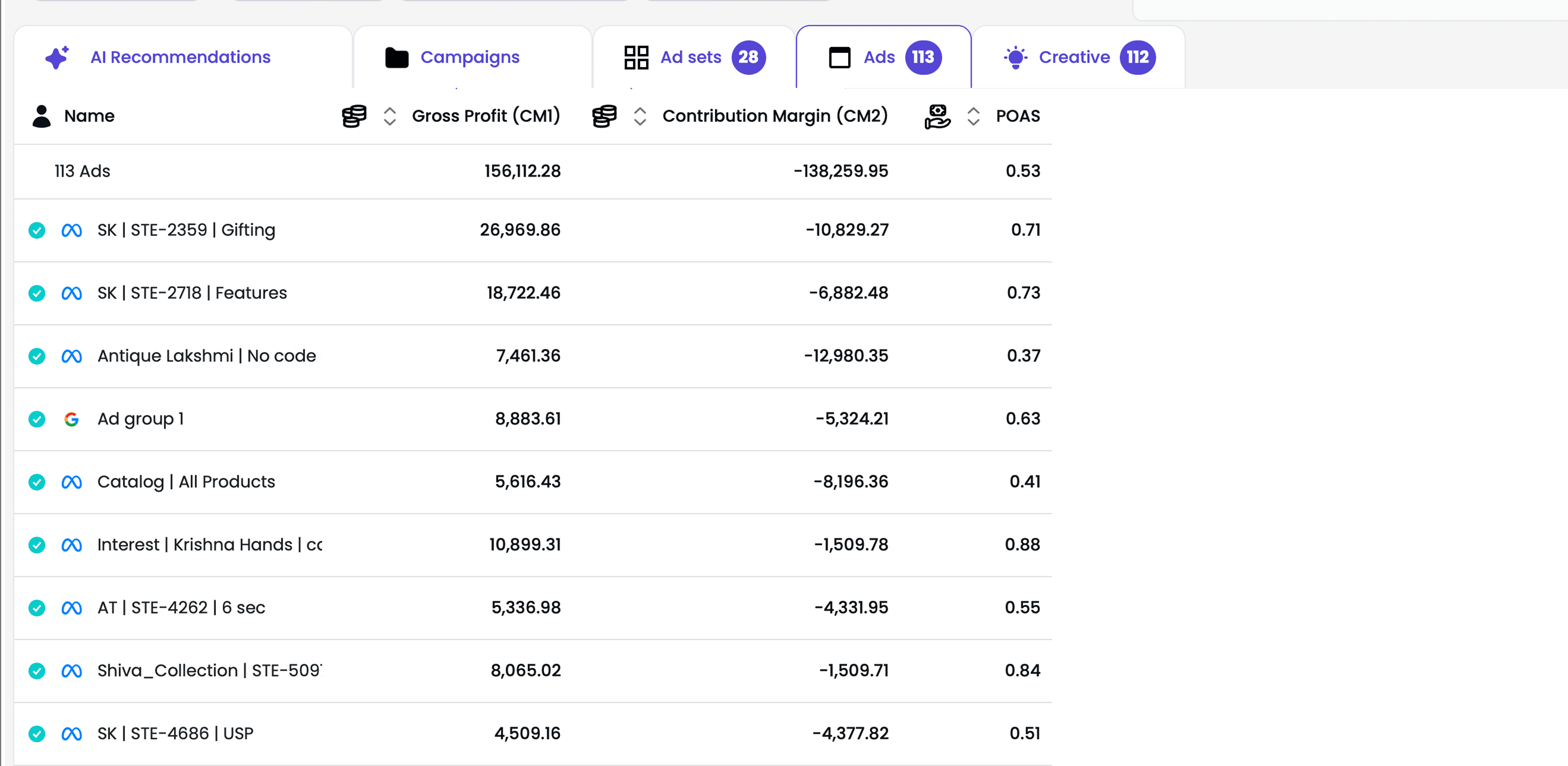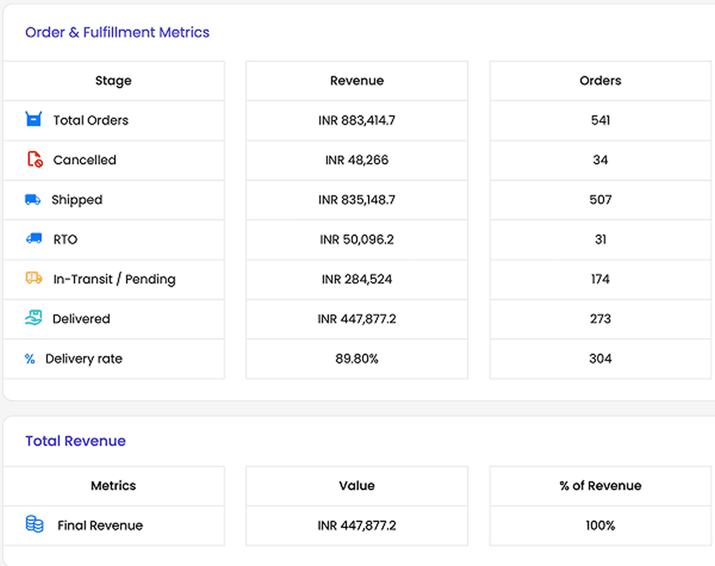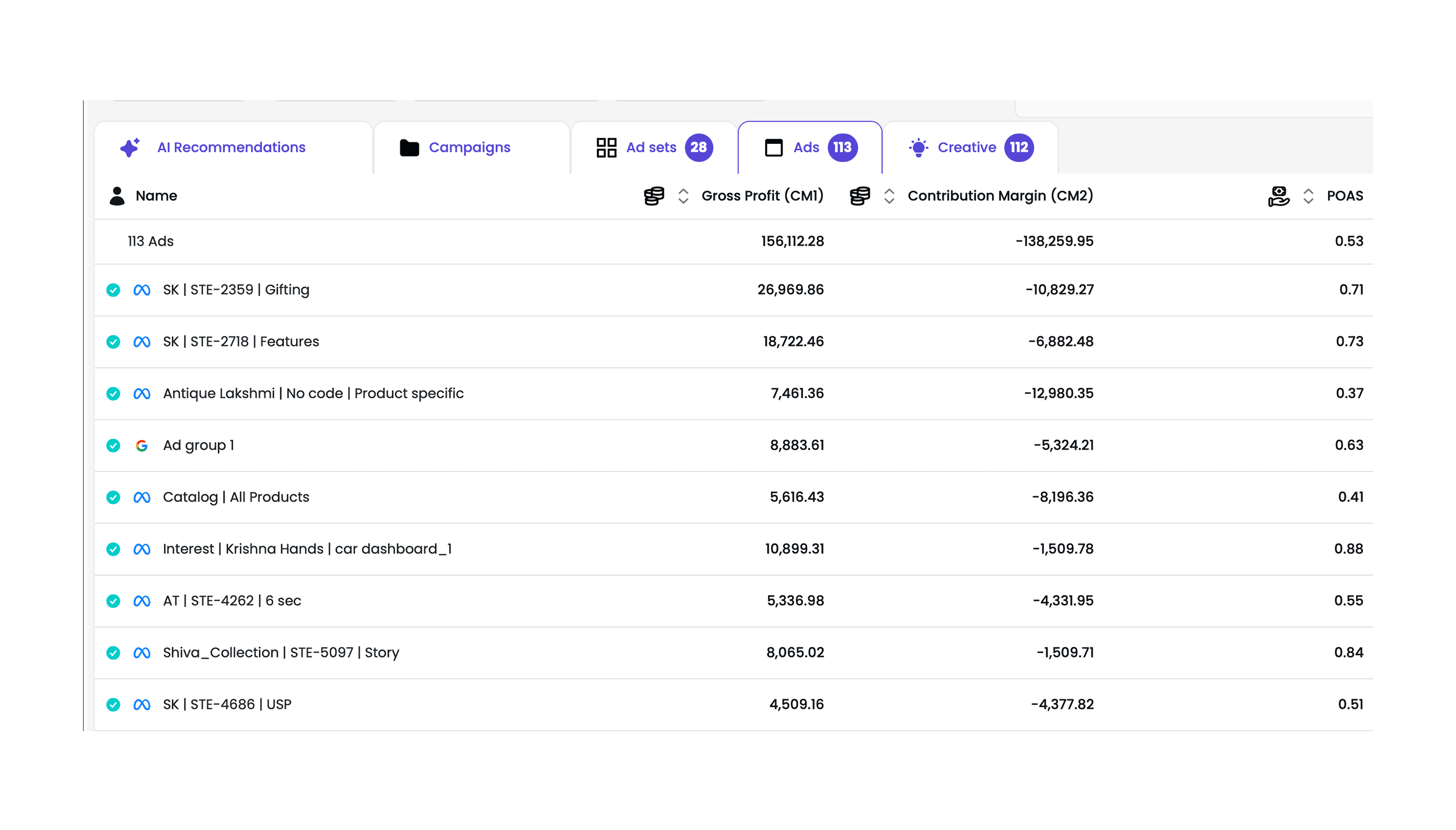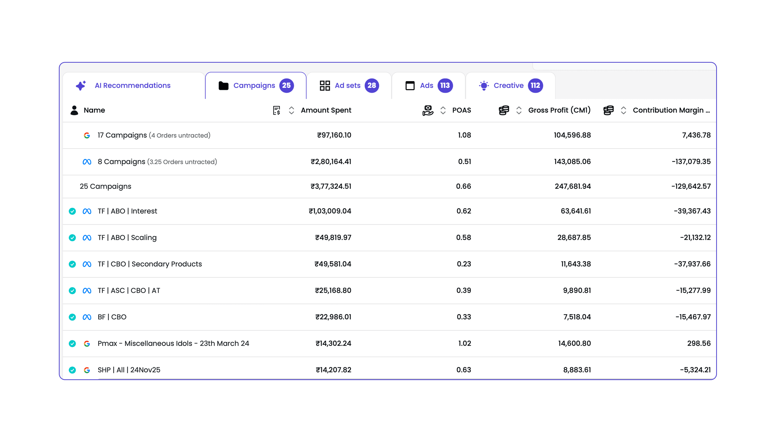 Integrations with Shopify (COGS) and Shipping (Shiprocket for live tracking of costs across fulfilment funnel.